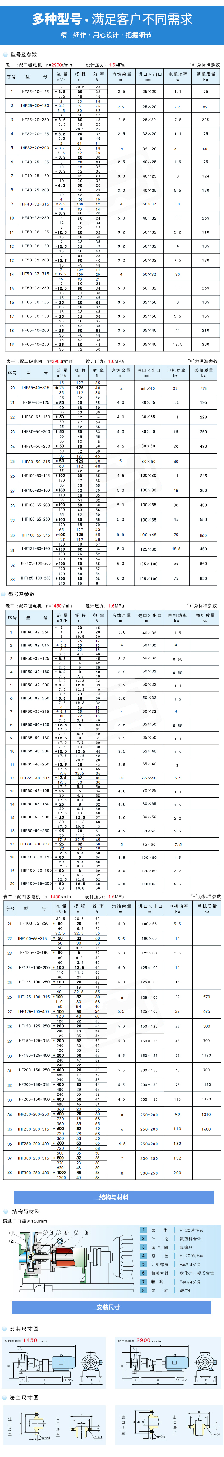 本產品廣泛適用于:汽車制造中的酸洗、噴漆工藝、有色金屬冾煉中的電解液輸送、離孑膜燒堿項目中的氯水、廢水處理和加酸等工藝流程。適用溫度:-20°~150°。 標準化設計 離心泵參照國際標準,結合國家相關標準設計制造。其性能、額定性能點和尺寸等效采用國際標準|SO2858。 國家標準號: GB/T5662 軸向吸入離心泵(16bar)標記、性能和尺寸 GB/T5656 離心泵技術要求(‖) 專剝襯里工藝 泵體和泵蓋均采用金屬(HT200)基體內襯氟塑料,葉輪采用金屬嵌件(WCB)外包氟塑料合金壓制成型。優點:耐腐蝕性范圍廣,強度高,經久耐用。 兩種密封結構 該系列泵采用兩種密封方式:單端面機械密封和雙端面機械密封,可根據具體工況條件選用。